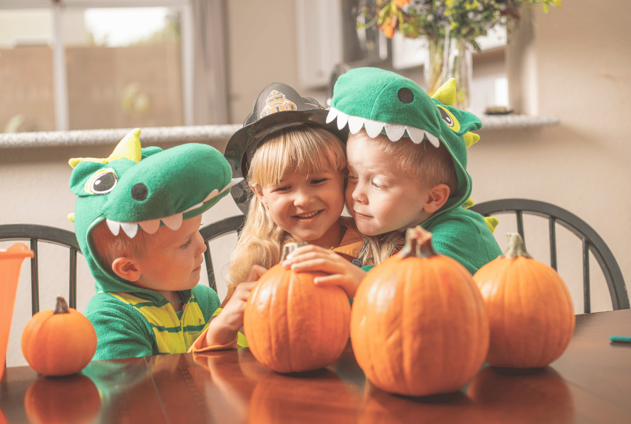 Line up a few small pumpkins and let kids roll them across the floor or yard. Try racing them to a finish line or weaving them through cones (or stuffed animals). This builds gross motor skills and gives kids a chance to practice persistence and teamwork if you do it in pairs.